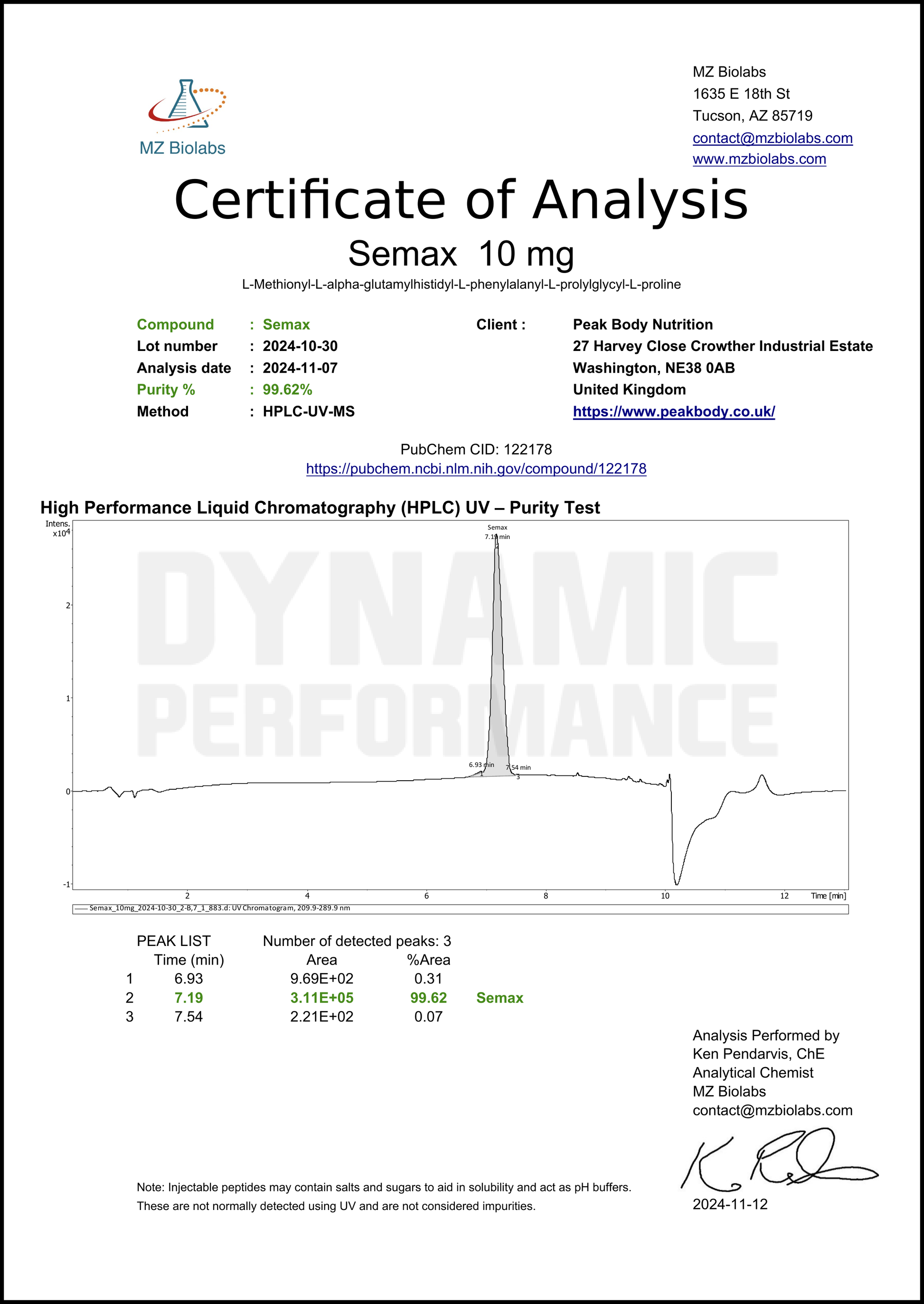 Semax is a synthetic research peptide derived from a fragment of adrenocorticotropic hormone (ACTH). It is commonly studied for its potential neuroprotective properties and its role in cognitive and neurobiological research models.